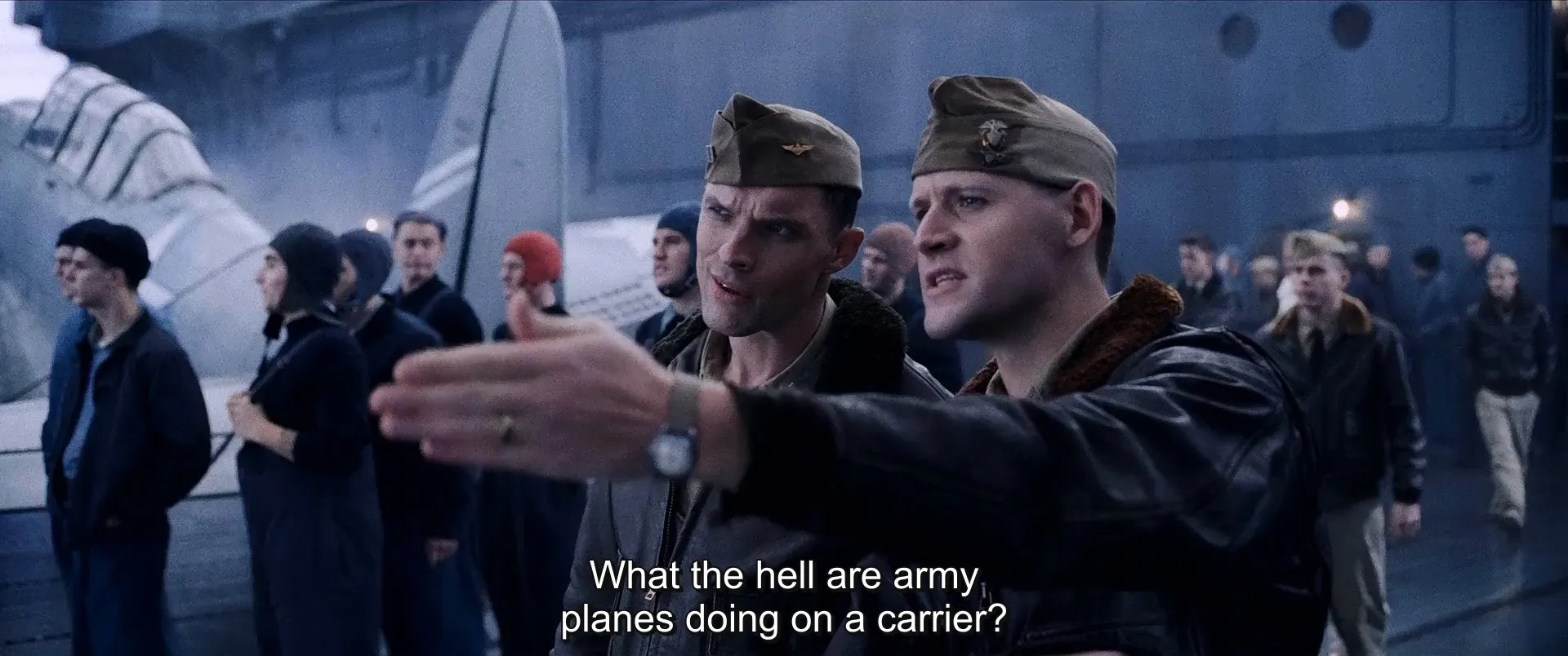 Cast: Ed Skrein as Lieutenant Richard 'Dick' Best, Patrick Wilson as Rear Admiral Edwin T. Layton, Woody Harrelson as Admiral Chester W. Nimitz, Luke Evans as Commander Wade McClusky, Mandy Moore as Anne Best, Luke Kleintank as Lieutenant Clarence Earle Dickinson, Dennis Quaid as Vice Admiral William 'Bull' Halsey, Aaron Eckhart as Lieutenant Colonel Jimmy Doolittle, Keean Johnson as Chief Aviation Radioman James Murray, Nick Jonas as Bruno Gaido, Etsushi Toyokawa as Admiral Isoroku Yamamoto, Tadanobu Asano as Rear Admiral Tamon Yamaguchi, Darren Criss as Commander Eugene Lindsey, Brandon Sklenar as George 'Tex' Gay, Jake Manley as Willie West, Jun Kunimura as Vice Admiral Chūichi Nagumo, Nobuya Shimamoto as Captain Tomeo Kaku, Brennan Brown as Commander Joseph Rochefort, Jake Weber as Rear Admiral Raymond Spruance, Alexander Ludwig as Lieutenant Roy Pearce, David Hewlett as Husband Kimmel, Mark Rolston as Ernest King, Eric Davis as Captain Miles Browning, Kenny Leu as Zhu Xuesan, Rachael Perrell Fosket as Dagne Layton, Peter Shinkoda as Cmdr. Minoru Genda, James Carpinello as William Brockman, Tim Beckmann as Captain Rawlings, Sarah Halford as Marie Pearce, Cameron Brodeur as Sully Brown, Hiromoto Ida as Prime Minister Tojo, Hiroaki Shintani as Emperor Hirohito, Russell Dennis Lewis as Ensigh O’Flaherty, Geoffrey Blake as John Ford, Mikaël Conde as Bill Miller, Madison Roukema as Barbara Best, Christie Brooke as Millicent McClusky, Dustin Geiger as Paul Crosley, Jason Lee Hoy as Pat Rooney, Ellen Dubin as Admiral King Secretary, Jason New as Marine Captain (Midway), Dean Schaller as Jack MacKenzie Jr., Jacob Blair as Hank Potter, Kayo Yasuhara as Geisha, Rudolph Wallstrom as Petty Officer (Pacific HQ), Matthew MacCaull as Staff Officer (Nimitz), Philip Fu-Kang Wang as Chinese Major, Johan Strombergsson-Denora as Radioman #1 (Enterprise SC), Nico DeCastris as Radioman #2 (Enterprise SC), Alexandre Dubois as Radar Officer (Enterprise), Tyler Elliot Burke as Radar Officer (Enterprise), Raphael Grosz-Harvey as Lt. JG (Hospital), Trevor Danielson as Talker, Agostino Michael Cimino as Buzz Davis (Sonar Tech Nautilus), Takeshi Kurokawa as Imperial Guardsman, Ryuta Kato as Japanese Junior Officer (Yamat), Garret Sato as Japanese Officer (Prison), Neil Girvan as Navy Yard Inspector, Ellis Arch as Lofton Henderson, Robert Crooks as McClusky's Radioman, Sean Colby as Gay's Radioman, Kasey Ryne Mazak as Signal Officer (Akagi), Ryo Hayashida as Deck Officer (Akagi), Michael Chapman as Helmsman (Nautilus), Masahiro Tanikawa Masa Tani as Damage Control Officer, Ryohei Arima as Japanese Lieutenant (Kaga), Hiro Kanagawa as Makigumo Captain, Ken Takikawa as Makigumo Lieutenant, Leonardo Boudreau as Passing Sailor, Tony Christopher as SBD Pilot (Enterprise), Yuta Takenaka as Staff Officer (Yamato), Tatsuya Shirato as Flag Officer (Yamato), Tyler Hall as William 'Slim' Townsend, Kyle Bougeno as Smoking Sailor, David Dacosta as Breathless Ensign (Enterprise), Kazuki Gonzalez-Adachi as Hiryu Helmsman, Reyn Halford as Torpedo Room Chief, Toyoaki Ito Leung as Japanese Boy (10 YO), Halta Nonen as Japanese Boy #2 (6 YO), Adrian Spencer as Chief Medic (Enterprise), James Hicks as Edwin Kroeger, Sebastian Pigott as Petty Officer #2, Simon Pelletier-Gilbert as Yorktown Spotter, Philippe Verville as Doolittle's Bombardier, Shigeru Yabuta as Japanese Duck Netting Officer, Seunghwan Min as Zero Pilots Squadron Leader, Christopher Tapia as Hiryu Pointer, Sangwon Jun as Hiryu Talker, Motoo Taira as Akagi Spotter, Ana Maria Lombo as Ballroom Singer